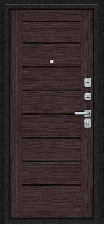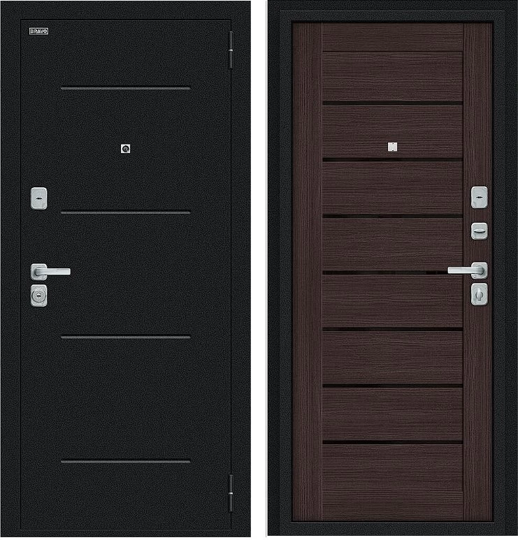 Надежная входная Дверь Браво Техно/BChrome Букле черное/Wenge Melinga премиум класса по цене 37 101 руб. Большая толщина стали защитит от проникновения в ваш дом, квартиру или коттедж. Используется очень качественная фурнитура: замки, цилиндры, ручки, защелки. Покрытие и отделка двери изготовлено под внимательным контролем производителя. Дверь имеет долгий срок службы и гарантию.