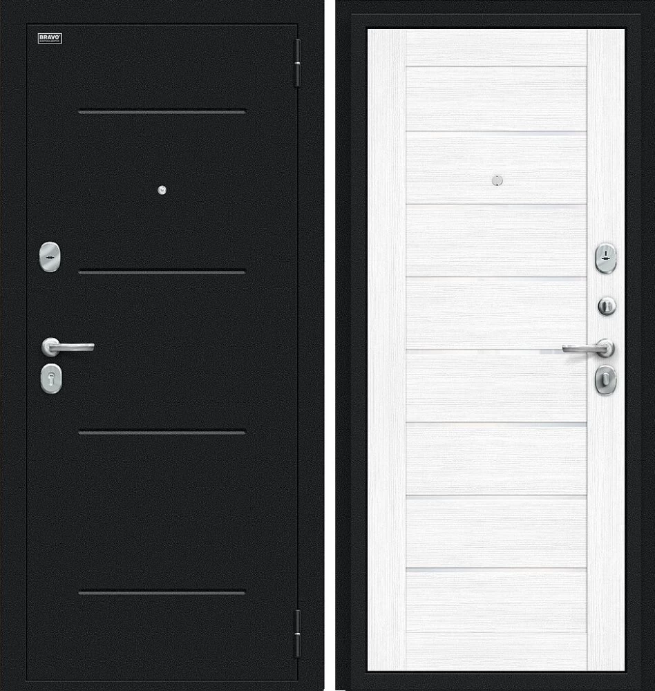Надежная входная Дверь Браво Техно Букле черное/Snow Melinga премиум класса по цене 33 451 руб. Большая толщина стали защитит от проникновения в ваш дом, квартиру или коттедж. Используется очень качественная фурнитура: замки, цилиндры, ручки, защелки. Покрытие и отделка двери изготовлено под внимательным контролем производителя. Дверь имеет долгий срок службы и гарантию.
