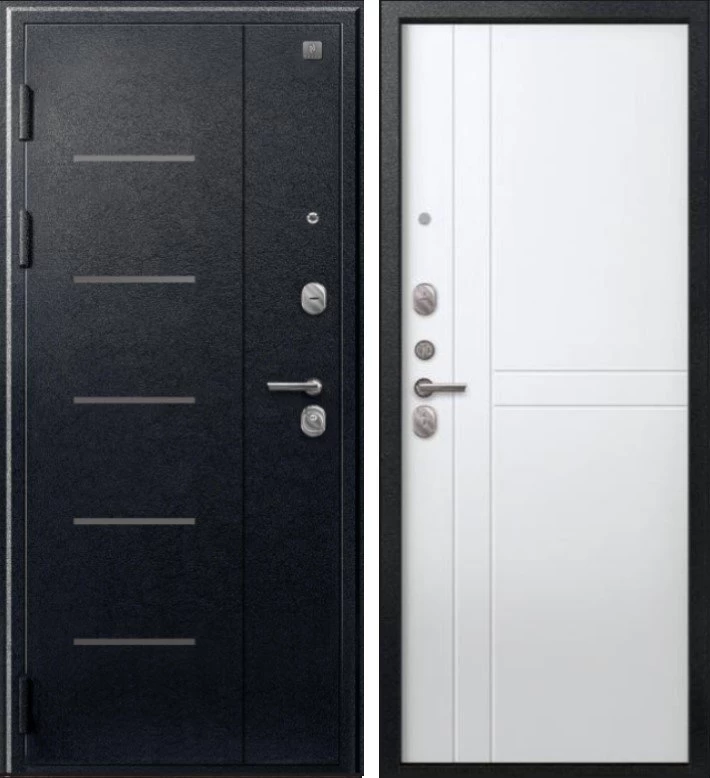 Надежная входная Дверь V-06 Черный муар - Белый премиум класса по цене 40 951 руб. Большая толщина стали защитит от проникновения в ваш дом, квартиру или коттедж. Используется очень качественная фурнитура: замки, цилиндры, ручки, защелки. Покрытие и отделка двери изготовлено под внимательным контролем производителя. Дверь имеет долгий срок службы и гарантию.